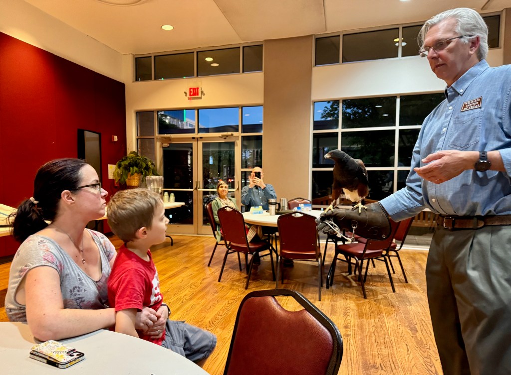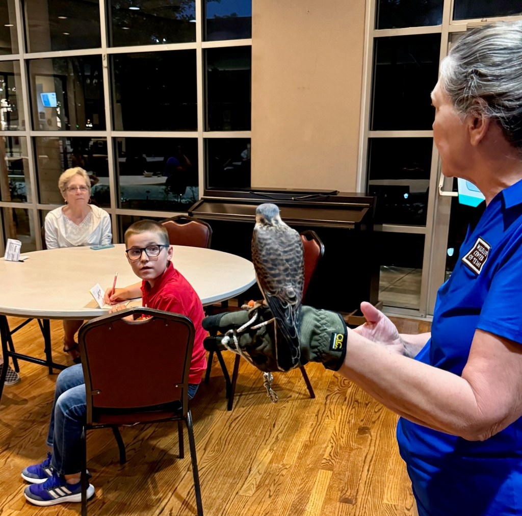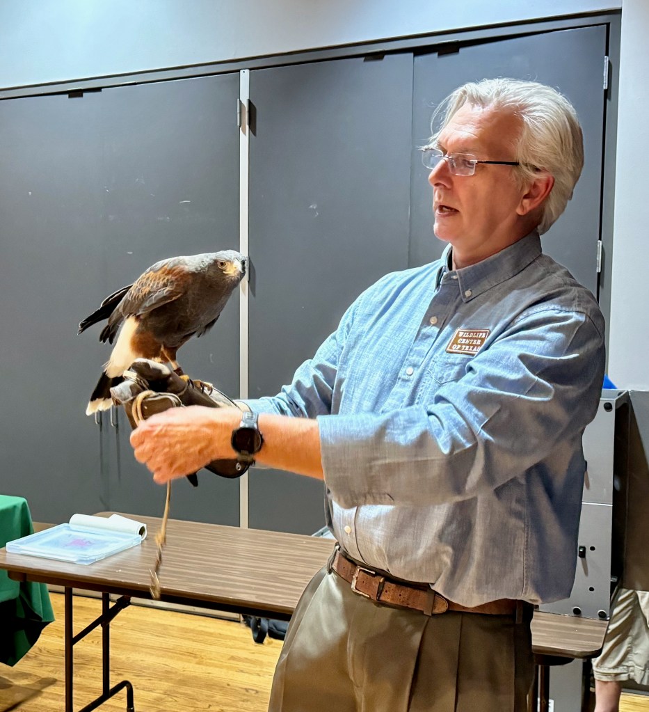 Last Friday, April 5th, we had a fun plant-based ice cream social followed by an engaging and educational presentation from the Wildlife Center of Texas. The wildlife center brought three ambassador animals: A Harris’s Hawk, a Caracara, and a Red-tailed Hawk. Adults and children alike were fascinated by the birds of prey and enjoyed the presentation from Randolph and Cindy. We appreciate the Wildlife Center of Texas for coming to see us and will have a shared offering for the center in June.