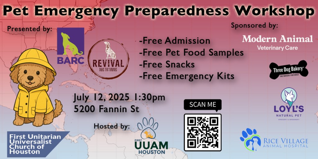 Sponsored by First UU Animal Ministry, BARC, Three Dog Bakery, Modern Animal, Loyls, Revival Dog Training, and Rice Village Animal Hospital.Your pets count on you—be prepared for them when it matters most!