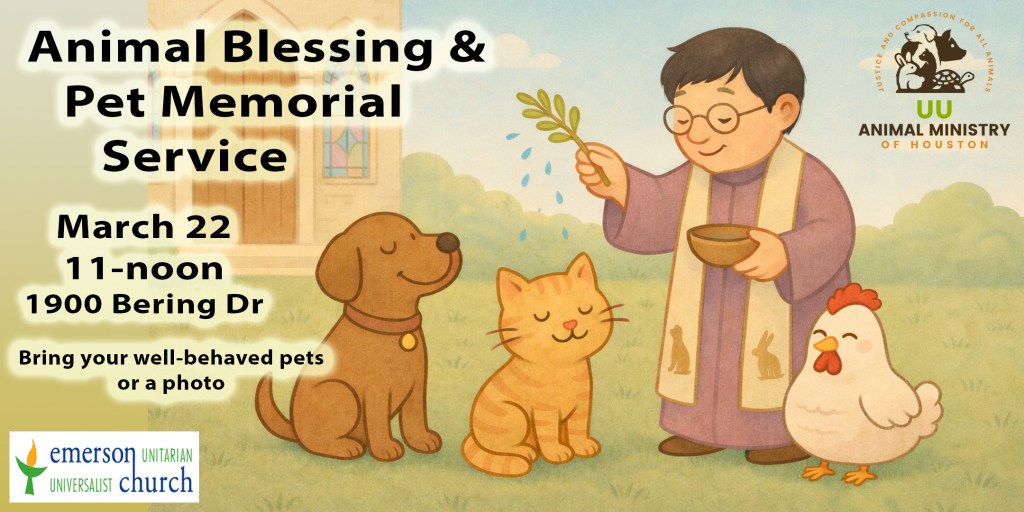 On Saturday, March 22nd at 11:00 AM, Emerson UU Church welcomes you to a special Animal Blessing and Pet Memorial Service at Emerson Unitarian Universalist Church (1900 Bering Drive).