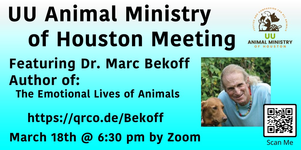 Join the UU Animal Ministry of Houston for our March gathering featuring a special presentation by renowned animal behaviorist, author, and advocate Dr. Marc Bekoff.